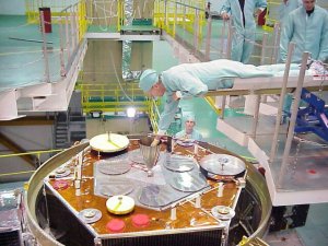 Figure 1. After stacking the Phase 3-D satellite on top of the Ariane 5, a technician removes the protection plug in the motor nozzle.